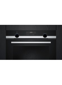 TIPO DE FORNO/MODO DE AQUECIMENTO Forno multifunções com 8 modos de aquecimento: ar quente 3D, calor superior/inferior, grelhar com ar quente, grelhar - grande quantidade, função pizza, Função coolStart, assar lentamente, ar quente suave Modos de aquecimento apenas disponíveis através da app Home Connect: função airFry, calor inferior, manter quente, pré-aquecimento Intervalo de temperatura 30 °C - 275 °C Volume: 71 litros SISTEMA DE RAILES Número de níveis de forno para colocar tabuleiro ou grelha: 5 Equipado com 1 nível de railes telescópicos DESIGN Comandos rotativos, iluminação, redondo LIMPREZA activeClean® - sistema automático de limpeza pirolítica Interior da porta em vidro CONFORTO Display LCD (branco) Relógio eletrónico, com regulação da duração e fim de confeção Sugestão automática da temperatura para cada função, Controlo de aquecimento, Modo sabático, Início automático, Termo sonda cookControl 30 (programas automáticos) softMove (abertura suave da porta) Puxador em inox Termo sonda para medir temperatura no interior do alimento Pré-aquecimento rápido automático Função coolStart Iluminação interior halogénea Turbina de arrefecimento Home Connect: controlo remoto através da app ACESSÓRIOS Acessórios incluídos: grelha, tabuleiro universal, tabuleiro esmaltado SEGURANÇA E AMBIENTE Porta com temperatura muito baixa Temperatura baixa da porta durante a autolimpeza pirolítica Porta com 4 vidros CoolTouch Bloqueio eletrónico da porta, Bloqueio de segurança para crianças, Desligar automático de segurança do forno, Indicador de calor residual, Interruptor contacto da porta INFORMAÇÃO TÉCNICA Comprimento cabo elétrico: 120 cm Tensão nominal: 220 - 240 V Potência de ligação 3.6 kW Classe de eficiência energética: A+ (numa escala de classes de eficiência energética de A+++ até D), Consumo de energia por ciclo na função de aquecimento convencional (ar quente): 0.94 kWh Número de cavidades: 1 Fonte de energia: elétrica, Volume da cavidade:71 litros MEDIDAS Dimensões do aparelho (AxLxP): 595 x 594 x 548 mm Dimensões do nicho (AxLxP): 585-595 x 560-568 x 550 mm